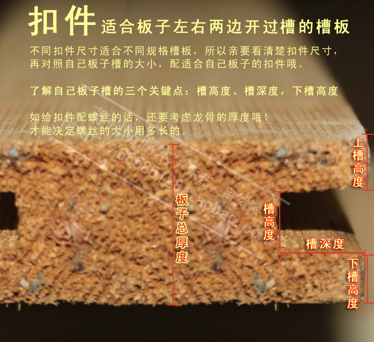《如你的板子測量下來不在我們所列出的數(shù)據(jù)之間范圍內,你可以把你板子的關鍵三個數(shù)據(jù)報給客服,客服會根據(jù)你的尺寸給你配適合你板子的扣件哦。》  很重要的幾點說明: 1、每個扣件尺寸不同,不是所有的扣件都能配所有的槽板的,所以: 配扣件時,一定要量好上圖這些數(shù)據(jù),要不然扣件買回去不一定適合你的板子用哦。 2、先買扣件再安排板子開槽: 如果是拿扣件回去再開槽的話,是最保險的了,值得推薦 3、免費索要扣件樣品,和客服聯(lián)系: 要是不放心質量,或是尺寸怕搞錯,能不能用得上,需要樣品的話,我們店里出售的所有扣件,都可以免費寄樣品,我們不承擔運費哦,所以著急可以寄順豐到付件,也可以寄普通的快遞,也可以網上拍一個,聯(lián)系客服修改價格哦!