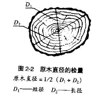 注:按前蘇聯(lián)標(biāo)準(zhǔn)和現(xiàn)行價格,長材比短材價格高10%,短材比規(guī)格材價格高10%。長、短材中,非標(biāo)準(zhǔn)材價格又略高。 。2)直徑檢量 、贆z量方法:直徑檢量以原木小頭斷面的最大直徑和最小直徑的平均值計,經(jīng)進(jìn)舍后為原木檢尺徑。 檢量原木直徑時,應(yīng)注意:一是要在小頭斷面;二是要去掉皮厚(長薪材除外);三是長徑、短徑不需要垂直交叉;四是不需要區(qū)分長徑、短徑的檢量先后順序;五是不論長徑、短徑均需通過斷面幾何中心進(jìn)行檢量;六是檢量時量至毫米,不足毫米者舍去。原木直徑的檢量見圖2-2。