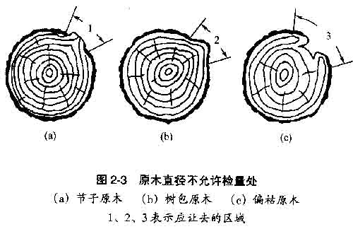 在某些特殊情況下,檢量原木直徑應(yīng)注意: a.不允許在節(jié)子、樹包及凹陷處檢量,應(yīng)讓去該部位(圖2-3)。